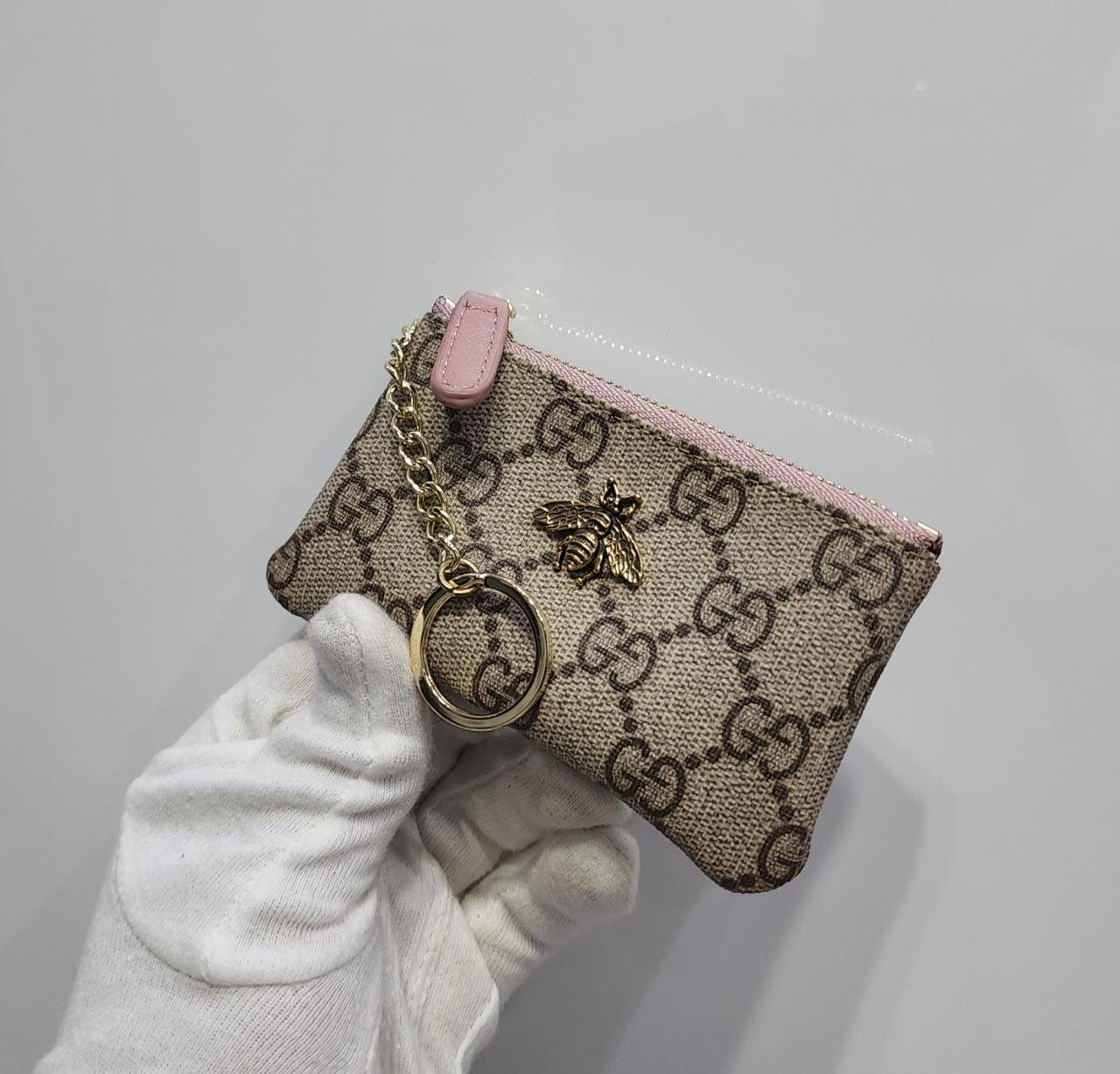 Interior: Lined in iconic Gucci logo print, featuring a detachable key clip.